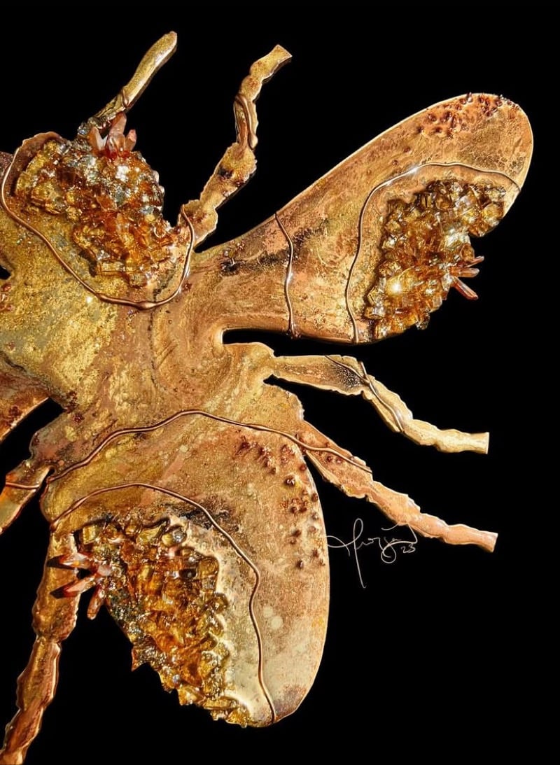 Custom 24" bumblebee epoxy piece, framed in a shadow box frame. White background, white frame. Ready to ship.